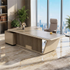 This executive desk features integrated LED ambient lighting and a storage cabinet. LED strips outline the desktop, casting soft, non - glare light for an elegant office vibe. The cabinet, with smart partitions, neatly stores documents and supplies. Blending style and utility, it suits executive/manager offices, boosting both aesthetics and efficiency.